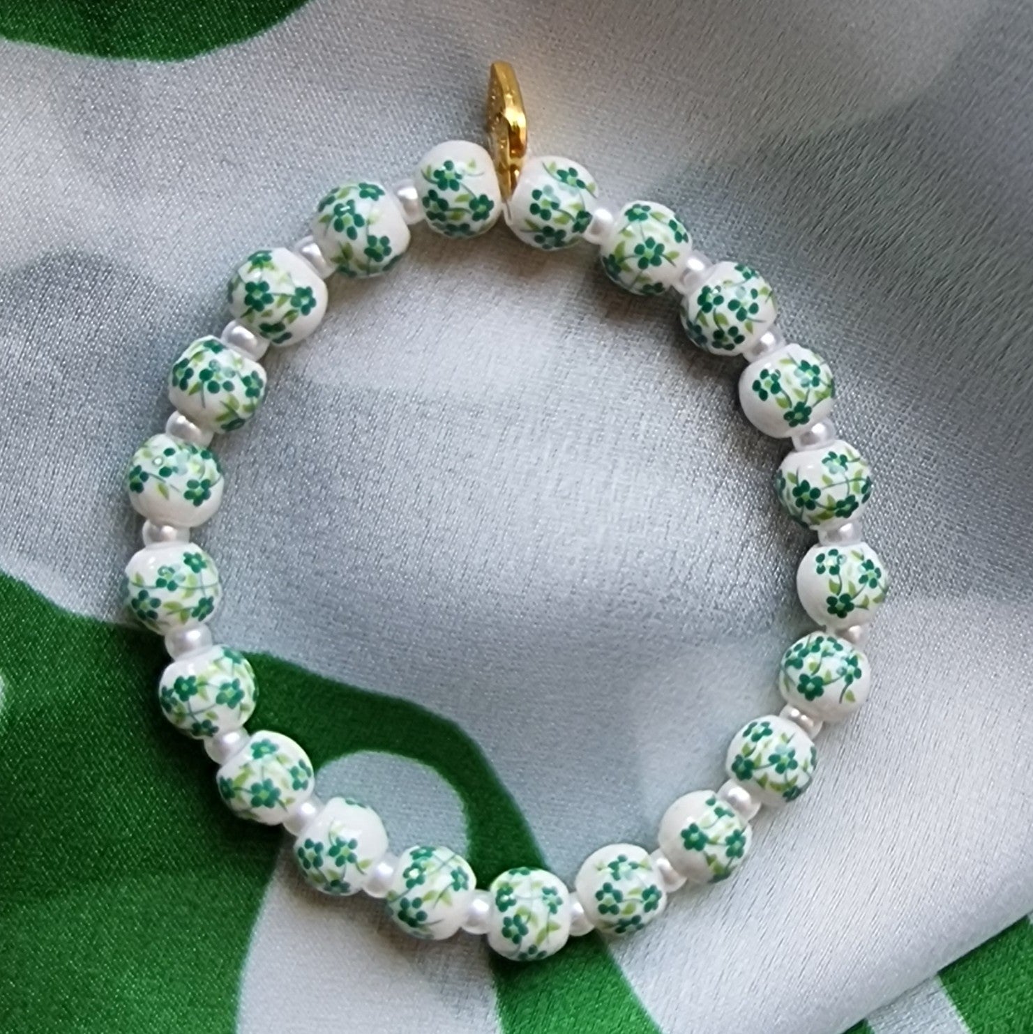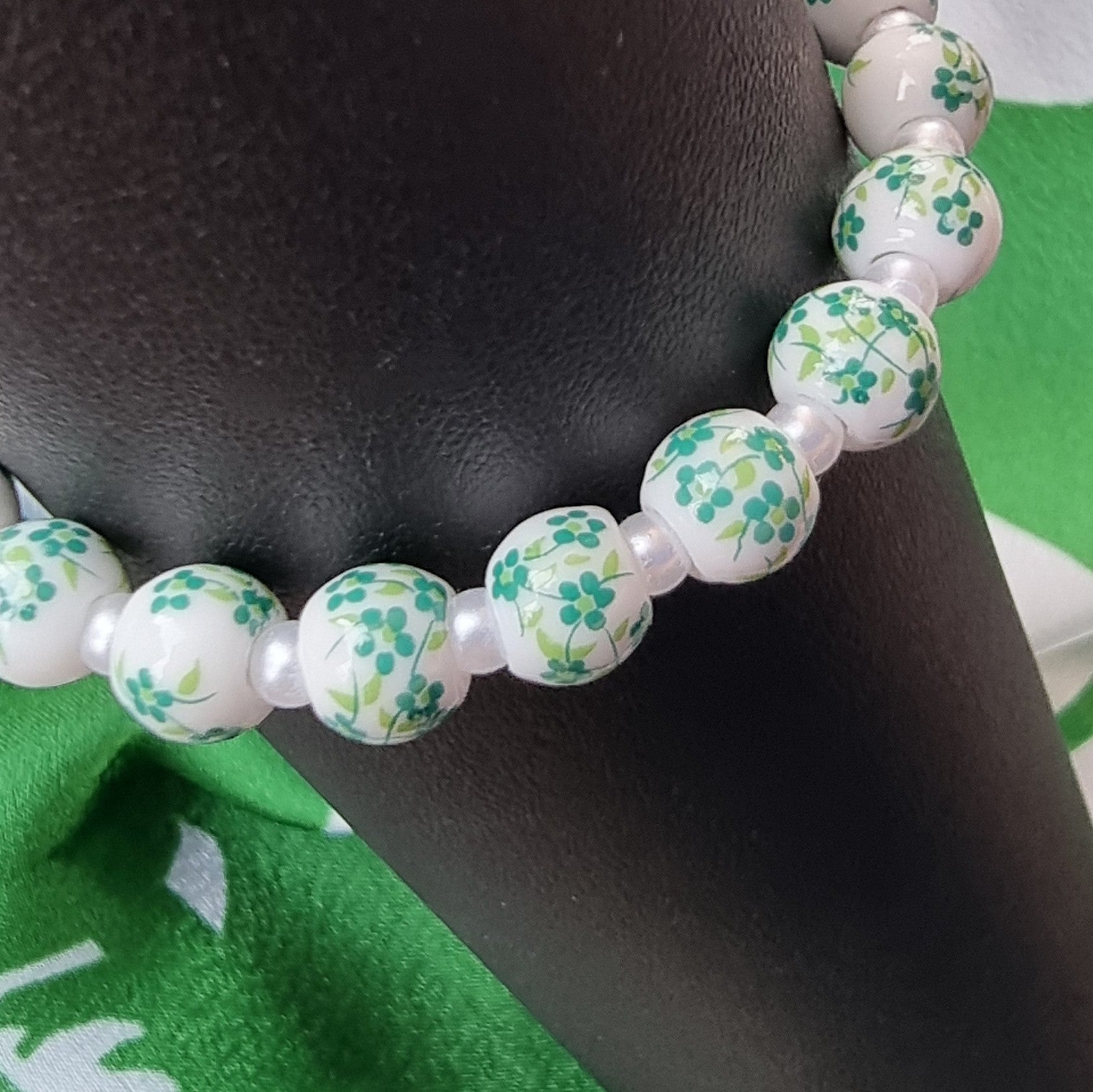 Håndlaget armbånd med elastisk strikk for å sikre god passform. Nydelige keramiske perler med blomstermønster. Armbåndet ksn bestilles i størrelse xs - xl (15 cm -19 cm).