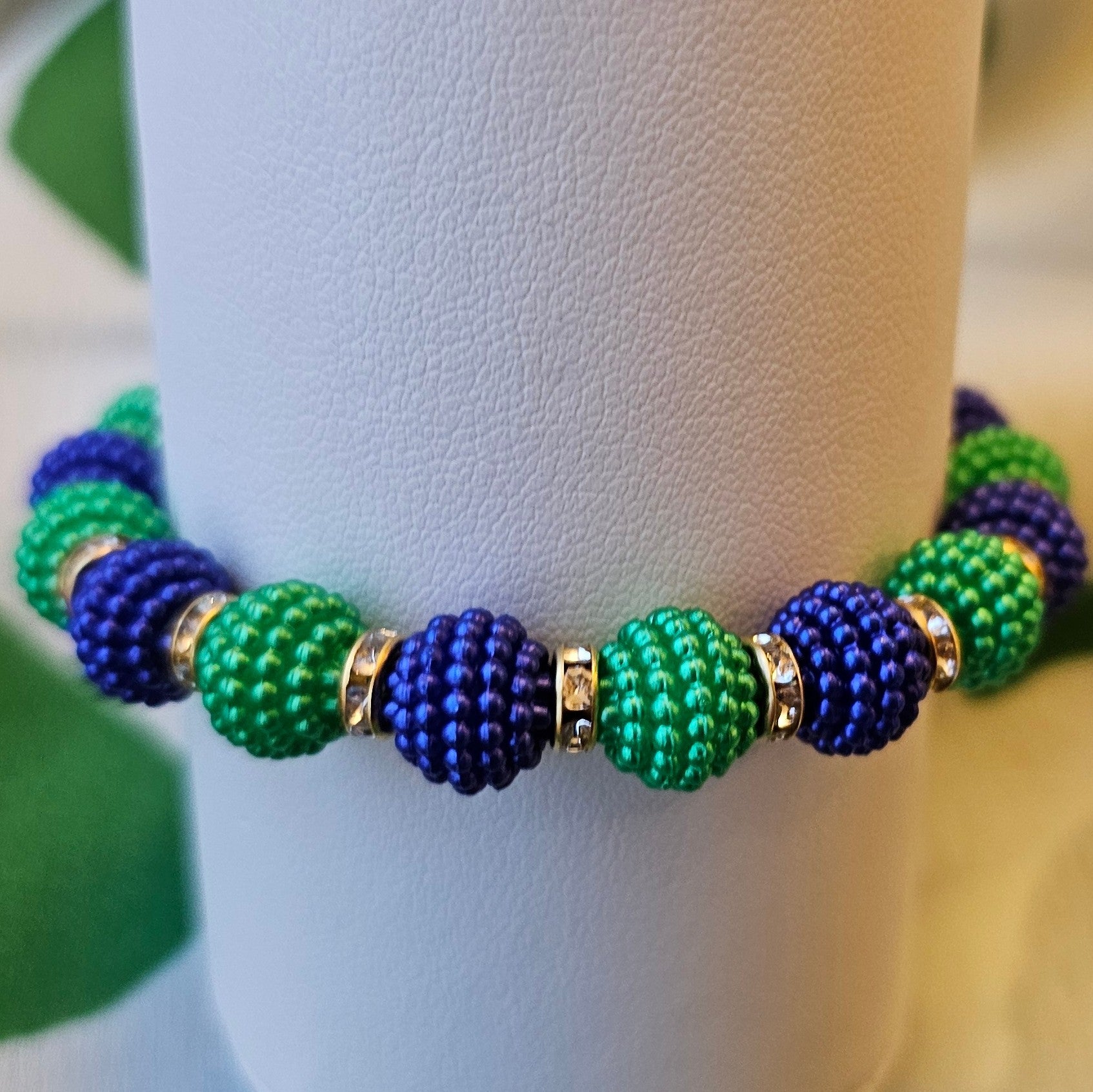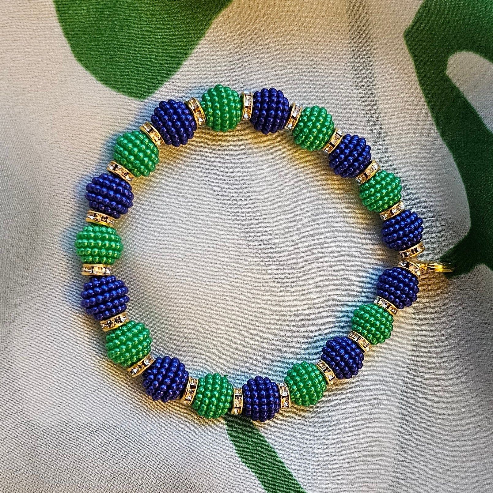 Håndlaget armbånd med elastisk strikk. Laget av bjørnebærformede akrylperler og akrylkrystal rhinestoneperler. Armbåndet kan bestilles i str. xs - xl (15 cm-19 cm).