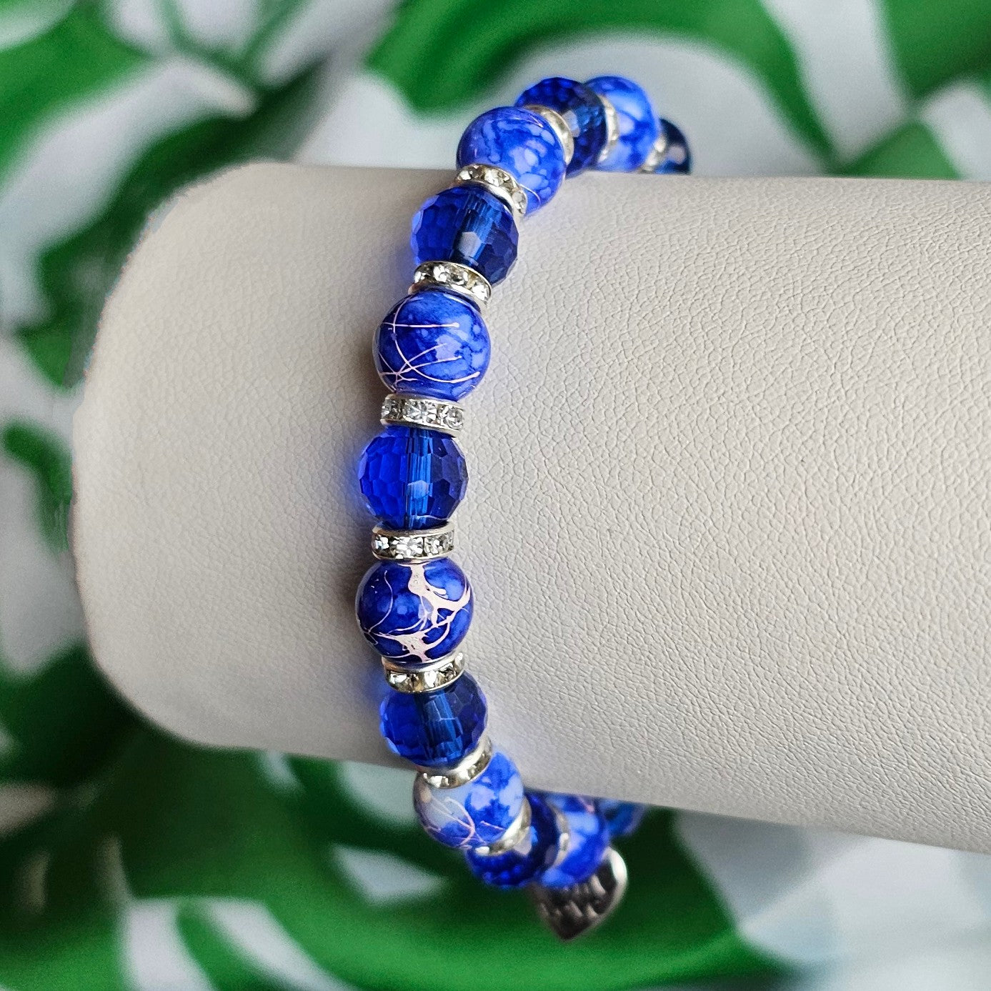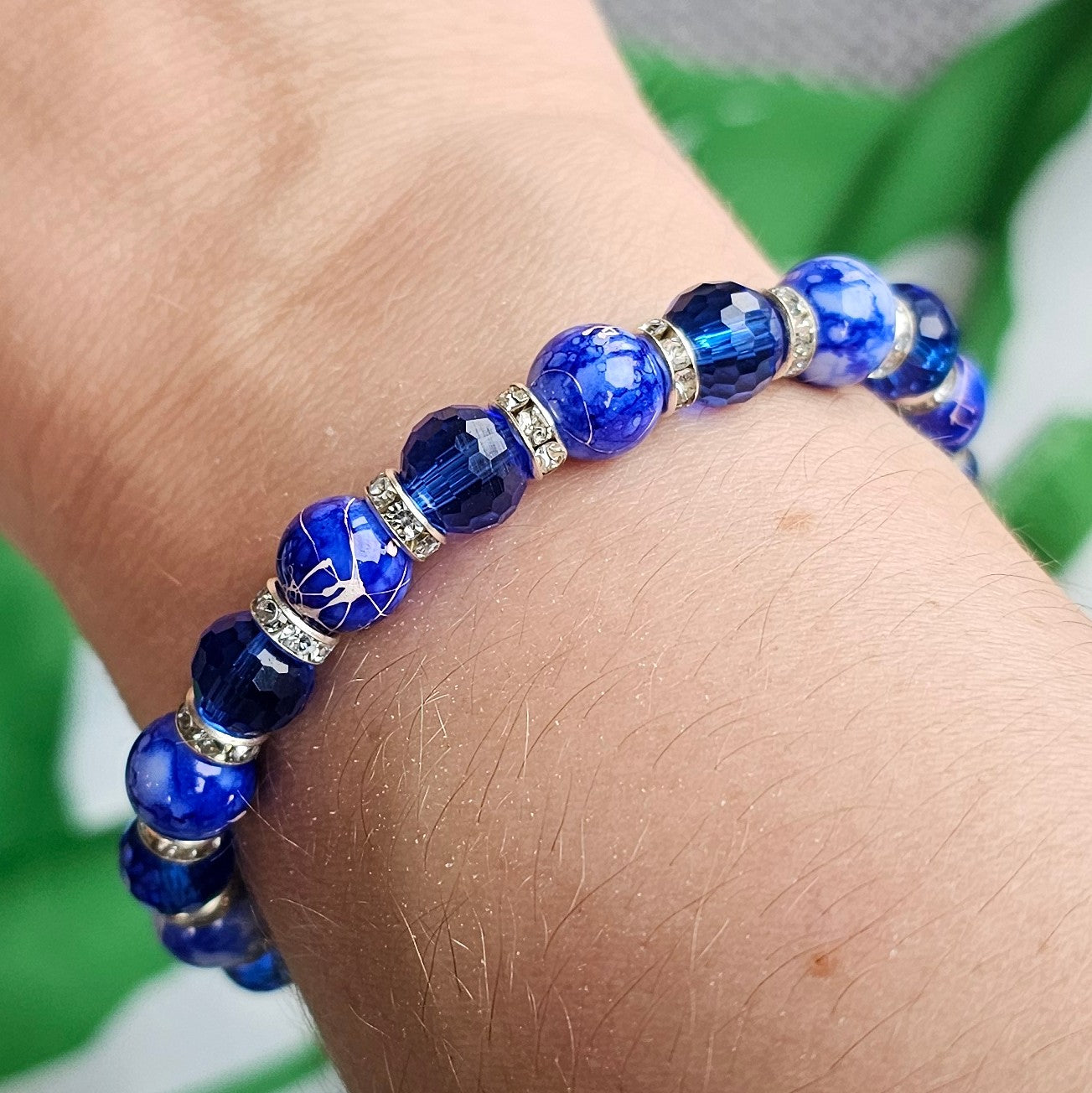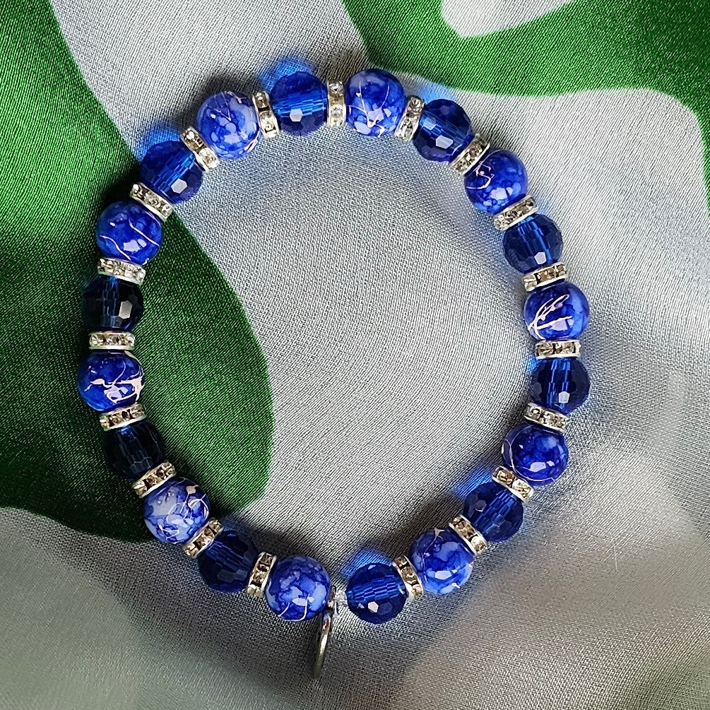 Håndlaget armbånd med elastisk strikk. Laget av blå glassperler og akrylkrystal rhinestoneperler. Armbåndet kan bestilles i str. xs - xl (15 cm-19 cm).