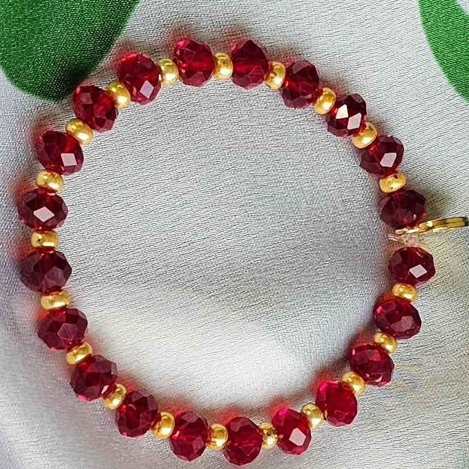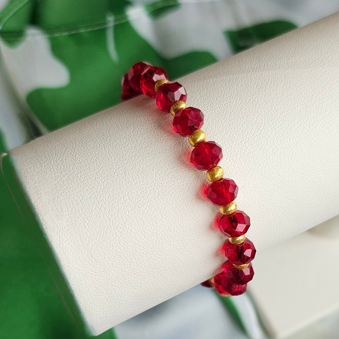 Håndlaget armbånd med elastisk strikk. Laget av røde østerriske krystallperler og tsjekkiske glassperler i gull. Armbåndet kan bestilles i str. xs - xl (15 cm-19 cm).