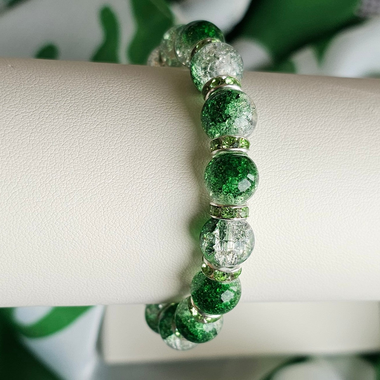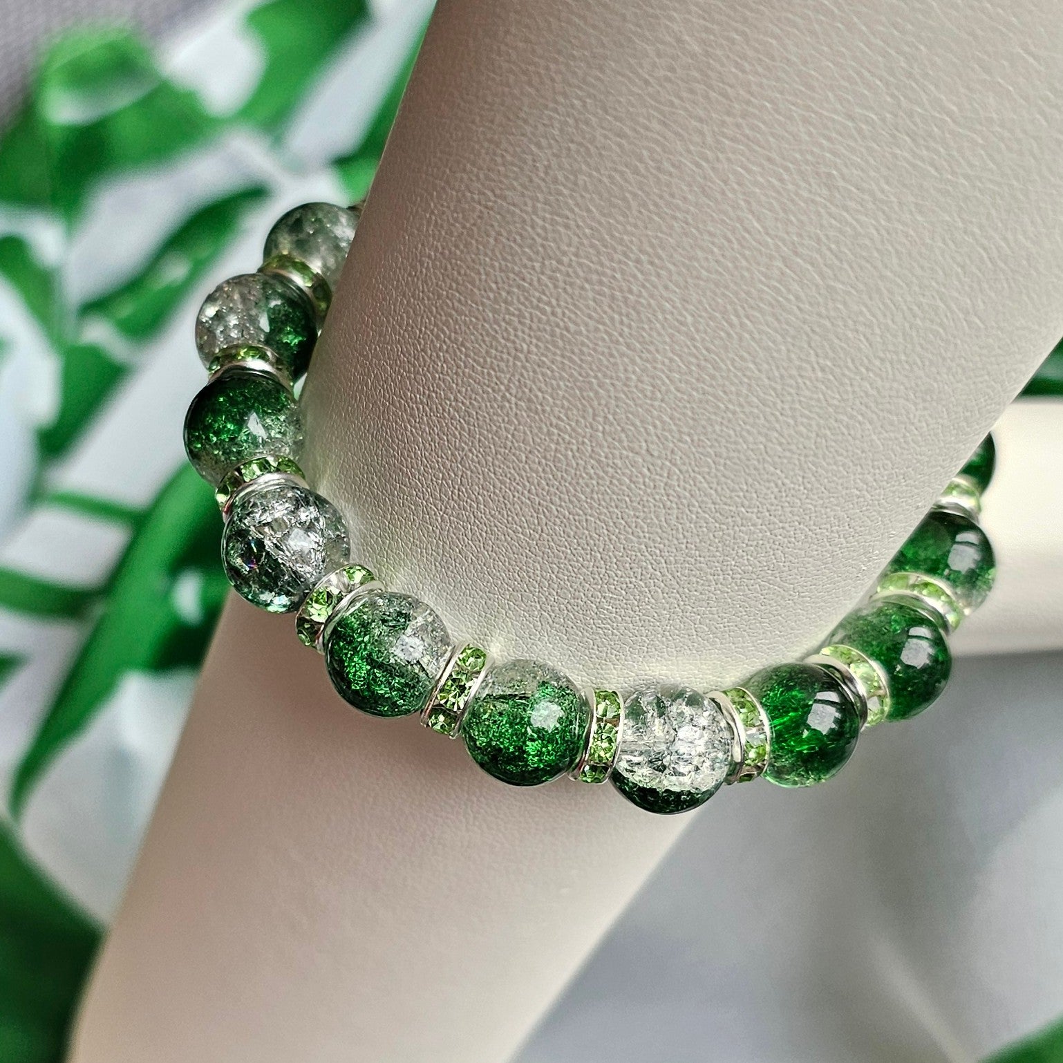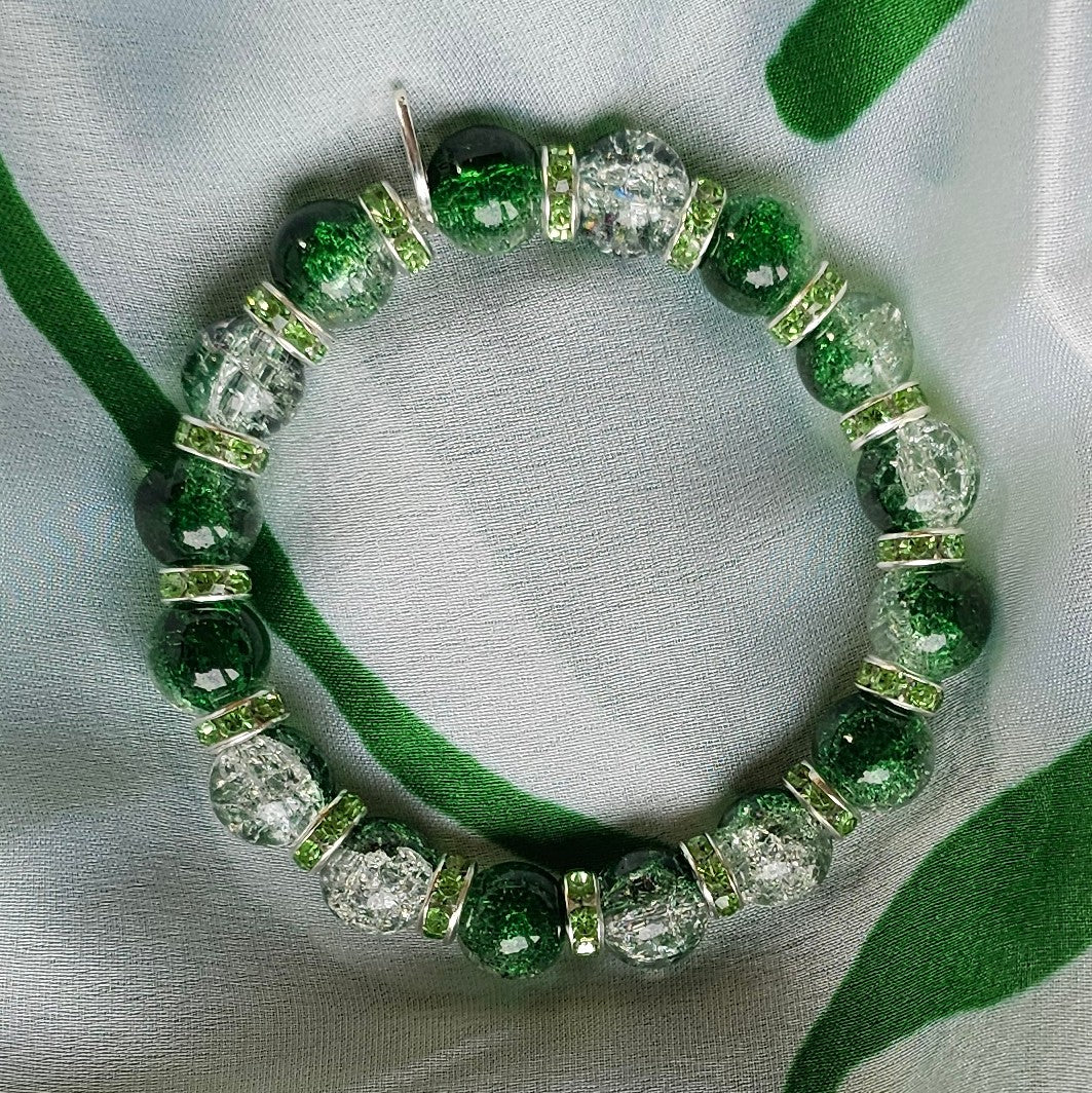 Håndlaget armbånd med elastisk strikk. Laget av grønne glassperler og akrylkrystal rhinestoneperler. Armbåndet kan bestilles i str. xs - xl (15 cm-19 cm).