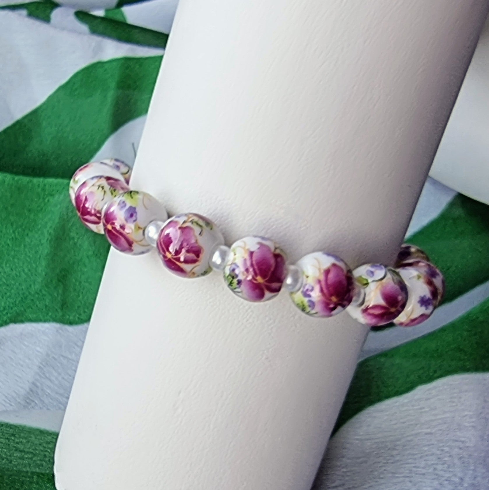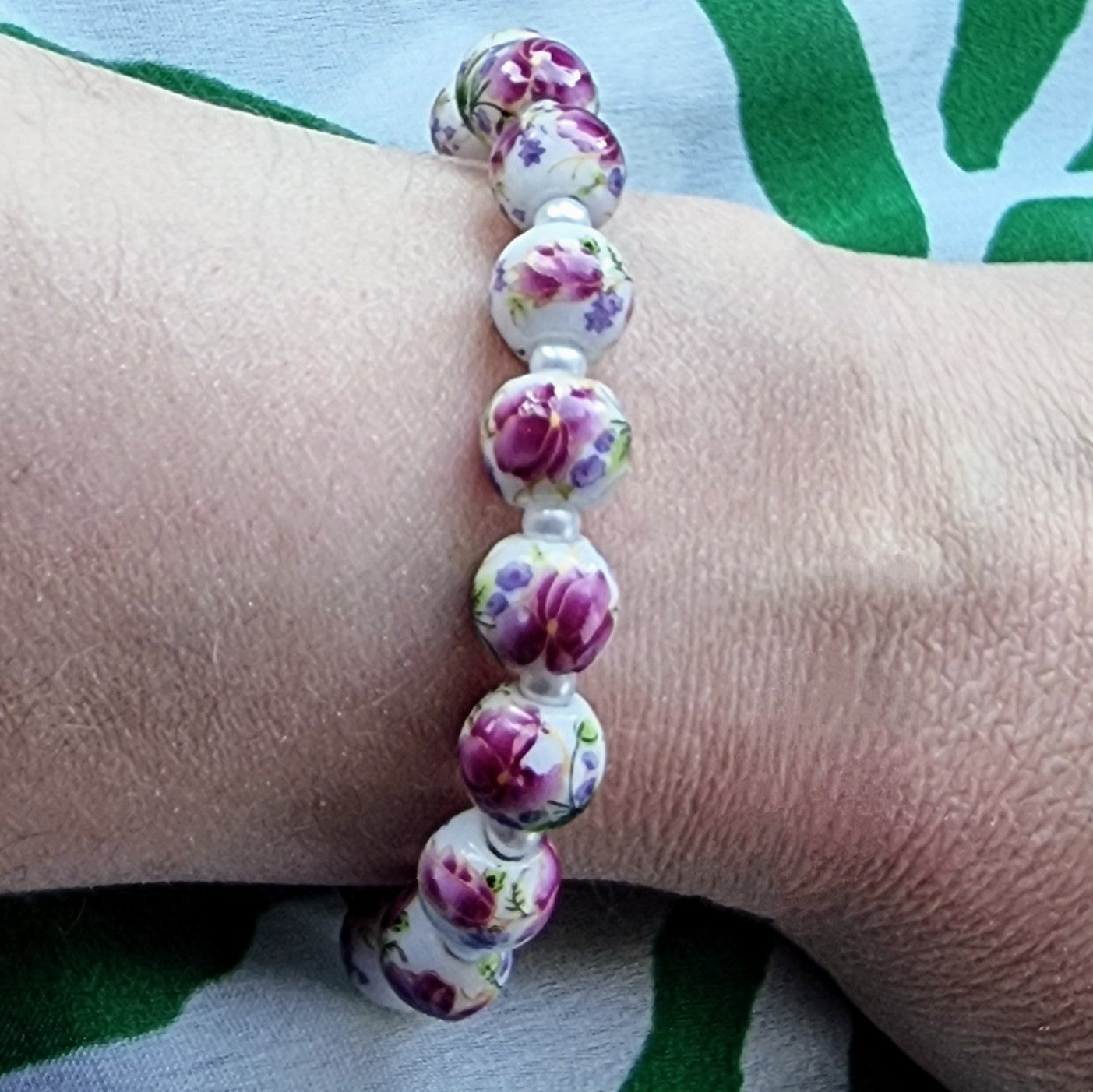 Håndlaget armbånd med elastisk strikk for å sikre god passform. Nydelige keramiske perler med blomstermønster. Armbåndet kan bestilles i str. xs - xl (15 cm-19 cm).