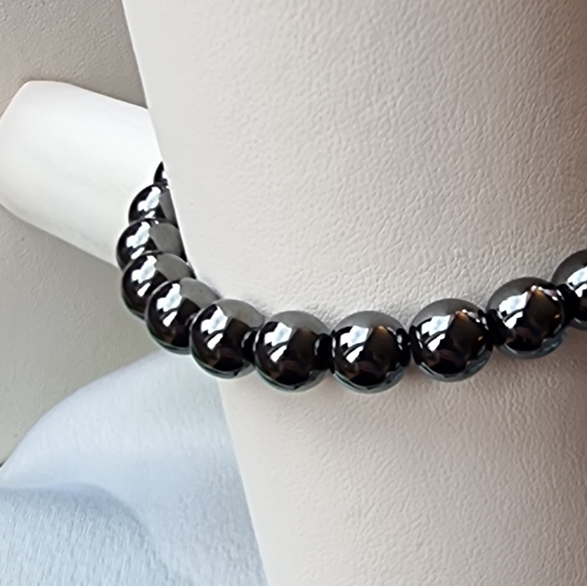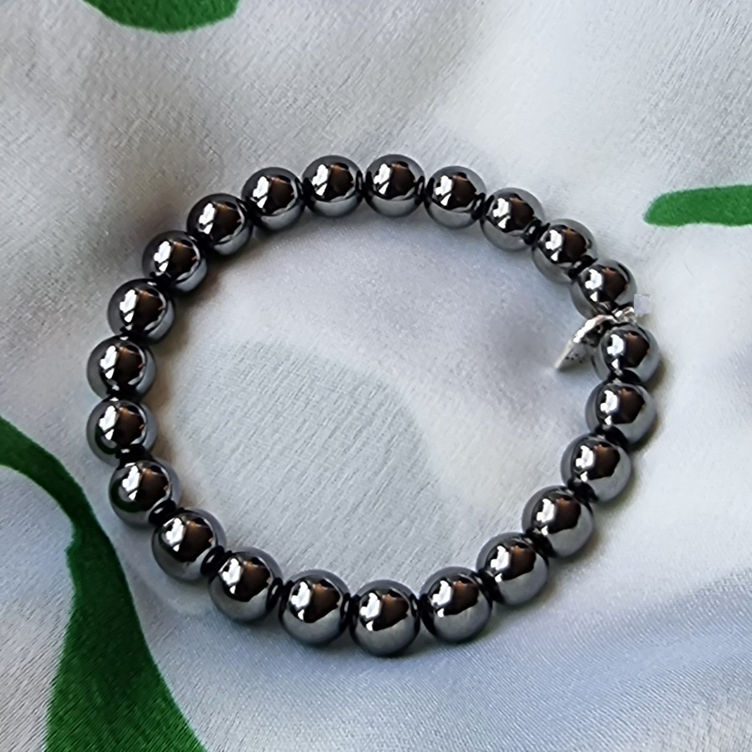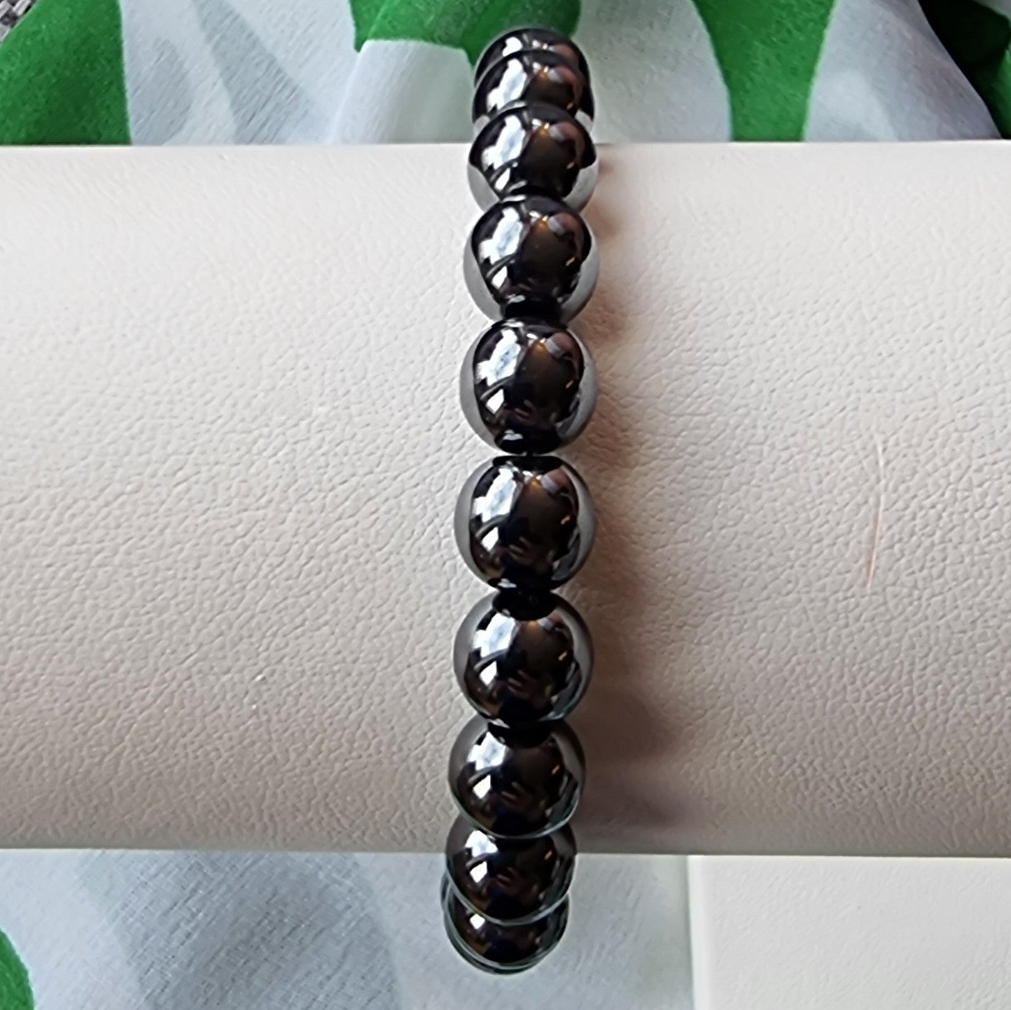 Håndlaget armbånd med elastisk strikk for å sikre god passform. Svarte hematittsteiner (blodstein). Armbåndet kan bestilles i str. xs - xl (15 cm-19 cm).